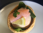 hartige tartelette/gepocheerde zalm cremeux/gerookte zalm